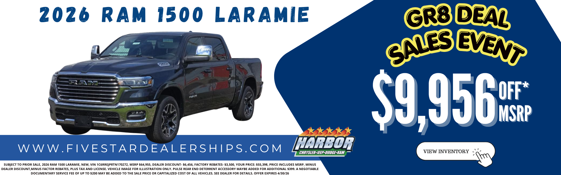A documentary service fee of up to $200 may be added to the price or capitalized cost of all vehicles. All financing is subject to credit approval. All vehicles are one of each. All 'Pre - Owned' or 'Certified' vehicles are used. Prices exclude tax, title, and license. All transactions are negotiable including price, trade allowance, interest rate (of which the dealer may retain a portion), term, and documentary service fee. Any agreement is subject to execution of contract documents. Every reasonable effort is made to ensure the accuracy of this data. Please verify any information in question with a dealership sales representative. Offers expire at the end of the current month.